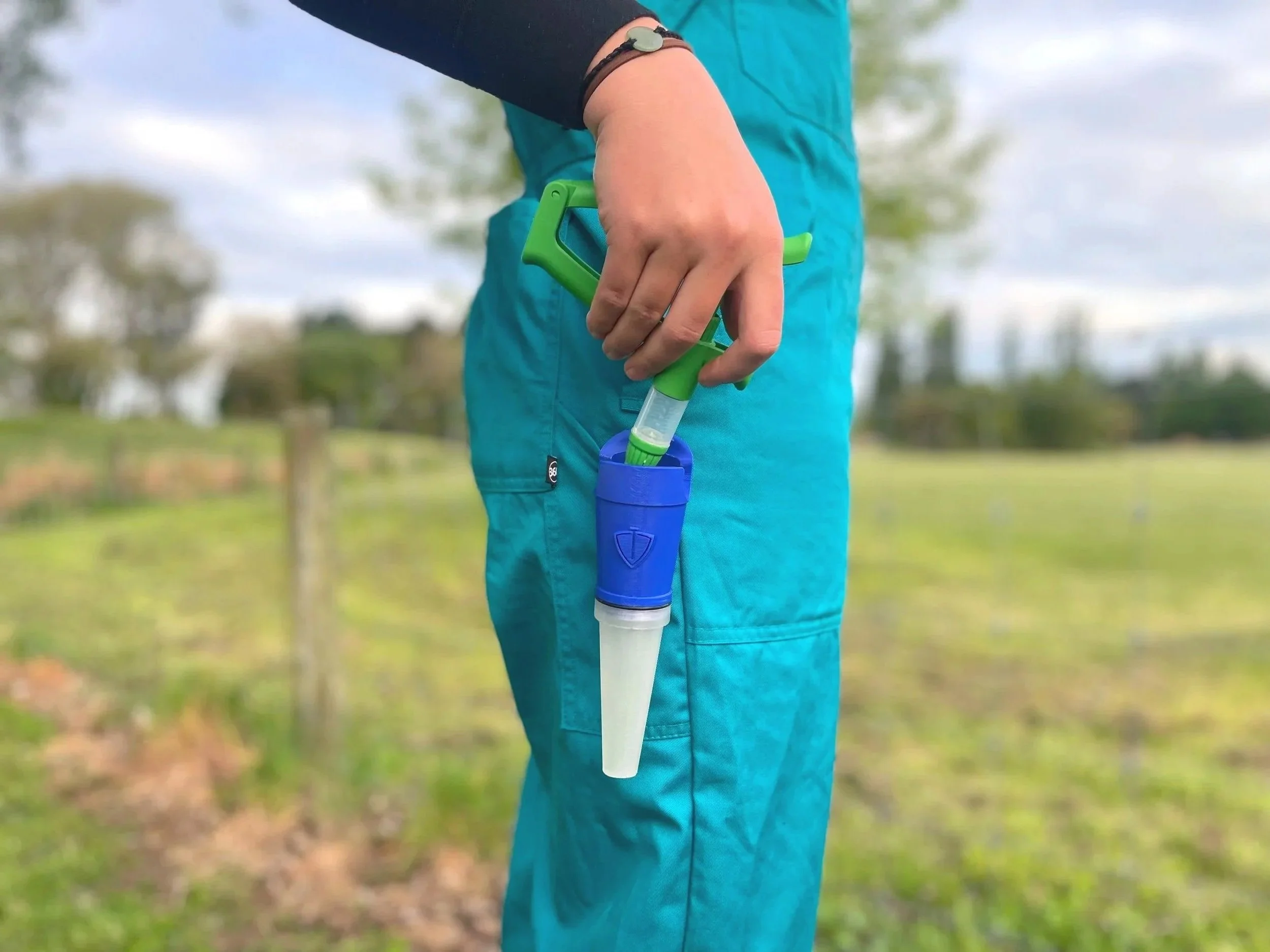 Our innovative holster sterilises needles between uses, reducing disease transfer, abscesses, and stress. It also provides a safe place to secure your vaccination gun, keeping it within reach and off the ground.